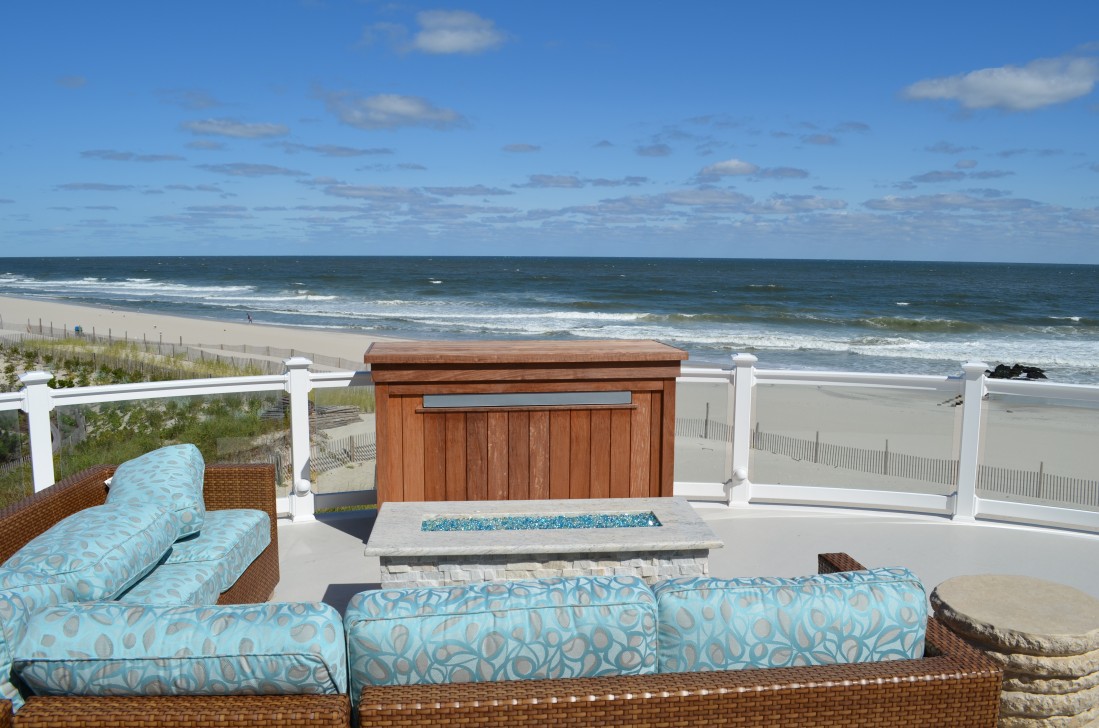 The final touch to this incredible project was simply having a tv outside on the upper deck. After using the tv their first summer, the customer said, “there is nothing better than watching the US Open in mid-June out on the deck while looking at the ocean.” However this isn’t just any outdoor tv, Hoishik did not want to block the beautiful view of the beach when it is not in use and wanted to protect it from the harsh ocean air. Hoishik contacted an engineer to help design and build a stunning wood box to store the tv when not in use. This tv can access all of the same devices in the video distribution system. When you select which device you want to watch, this 55inch tv will flawlessly rise out of the box for the ultimate viewing experience. When the off button is pressed, the tv will lower back down into the box. To complete this experience, nights with an ocean breeze can make sitting on the deck a little chilly, yet the customer still wants to enjoy the outdoor television. Without moving from the couch, from their smart phones, the customer can effortlessly turn on their outdoor infrared heaters to the desired temperature.