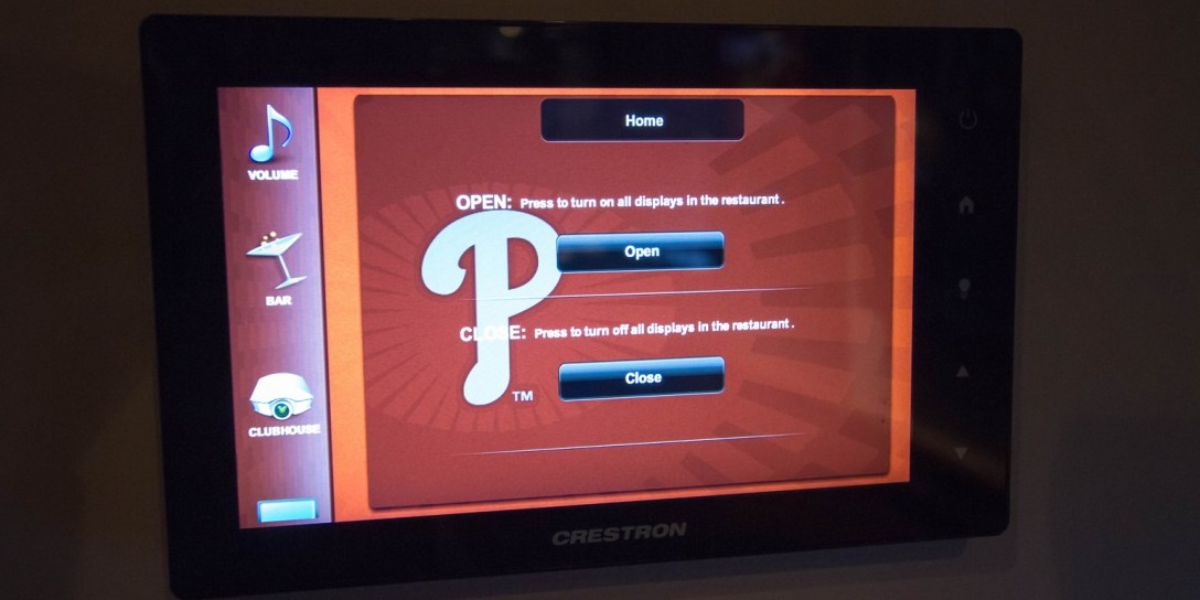 It’s hard to believe technology has advanced so much in the last 20 years but Damon’s existing system was complex and difficult to control. To accommodate the diverse customer base at the restaurant and desire to showcase many sporting events, Hoishik installed a Crestron DM video distribution system. This eliminates the need for a cable box at each TV and allows them to share and handful of hidden cable, boxes, satellite boxes, Blu-ray players, computers or internet streaming devices with any TV. Often times in a restaurant, you have the same channel or sports program playing on multiple TVs. With DM, it is simple to accomplish this along with reducing cable & satellite box quantities. With custom programmed iPads and carefully placed touch panels, we set up a simple button press that any staff member can press when the restaurant opens to turn on all of the TV’s, projectors, and sound to preset TV channels. A waitress or bartender can very simply change the channel or volume on any TV with the press of a button.